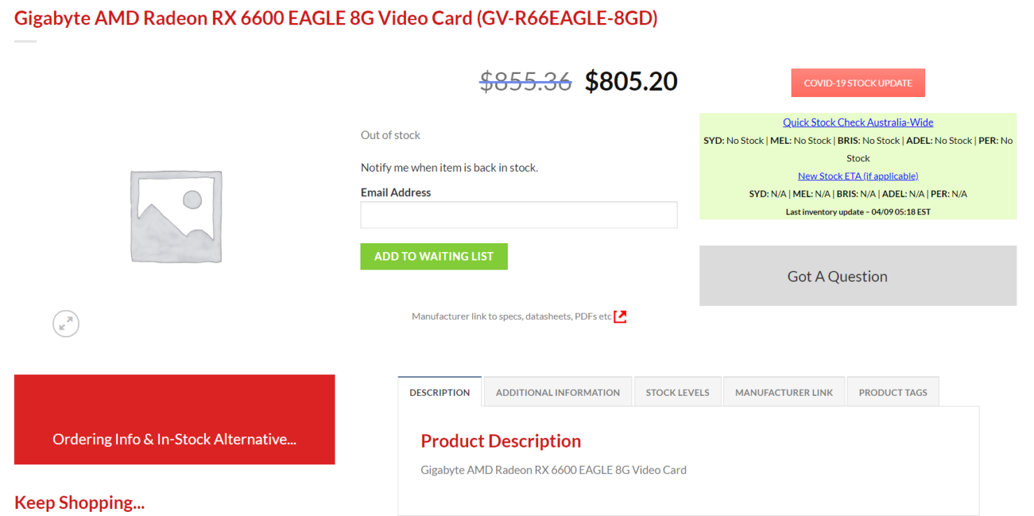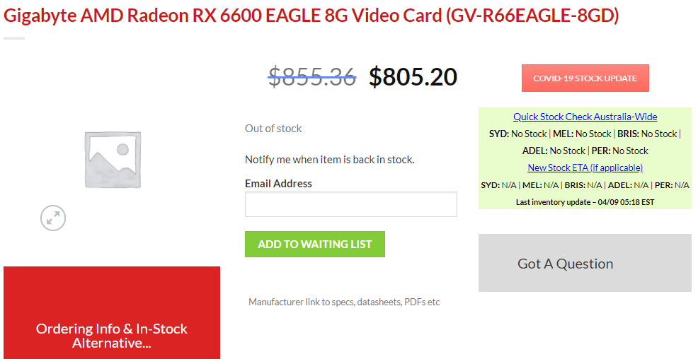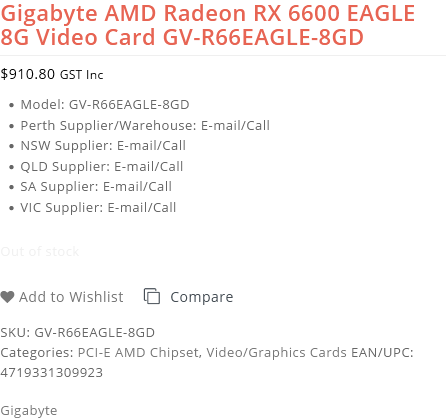 В Австралии в двух магазинах города Перт появилось предложение о покупке видеокарт Radeon RX 6600 производства компании Gigabyte. Стоимость видеокарт составляет 805,2 и 910,8 австралийских долларов. Вторая сумма, вероятно, указана с учетом местных налогов. Естественно, что купить их в данный момент нельзя.