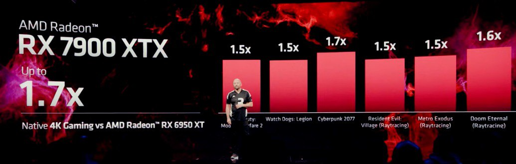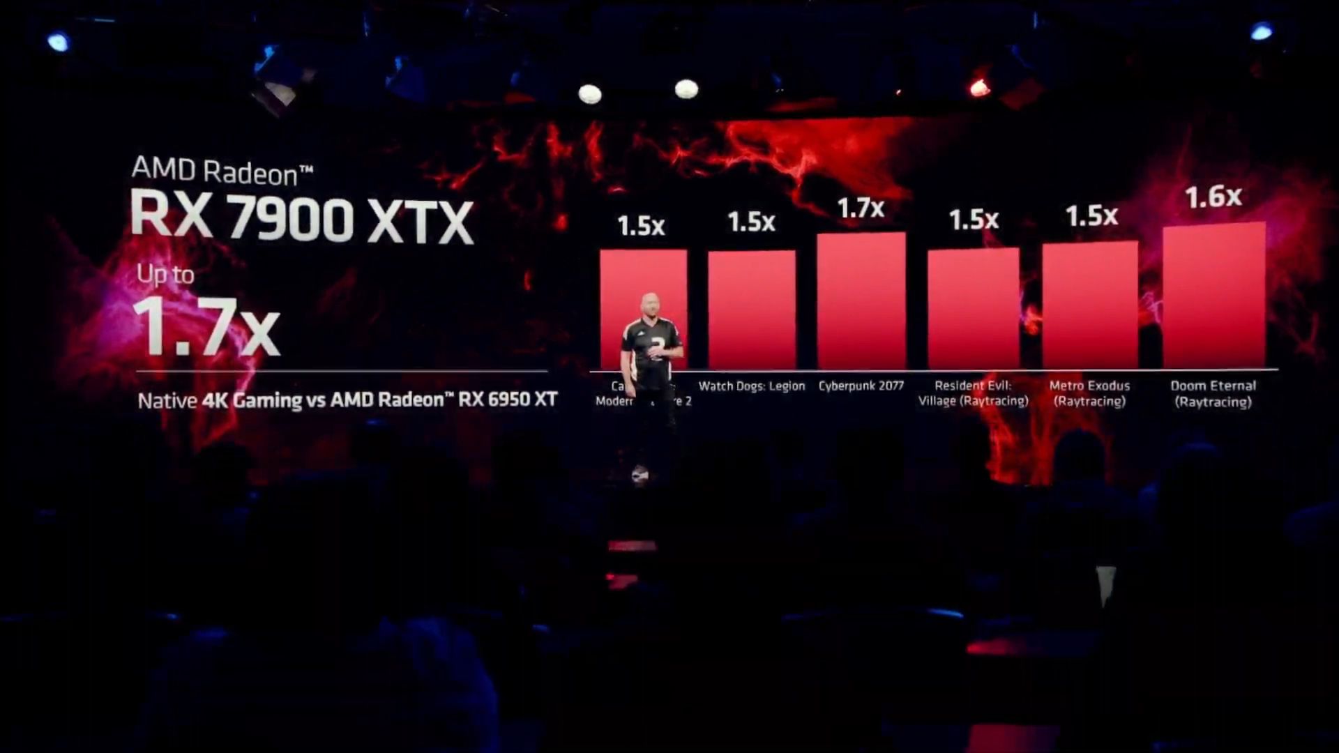 В процессе официальной презентации представители «красной команды» сравнили уровень производительности представительниц серии Radeon RX 7000 с достижениями их предшественниц: так, согласно результатам тестирования специалистов AMD, флагманская Radeon RX 7900 XTX в ряде игр при разрешении 4K в нативном режиме оказалась быстрее Radeon RX 6950 XT до 1.7 раза, а предтоповая Radeon RX 7900 XT была производительнее RX 6900 XT вплоть до 1.5 раза в аналогичных условиях.