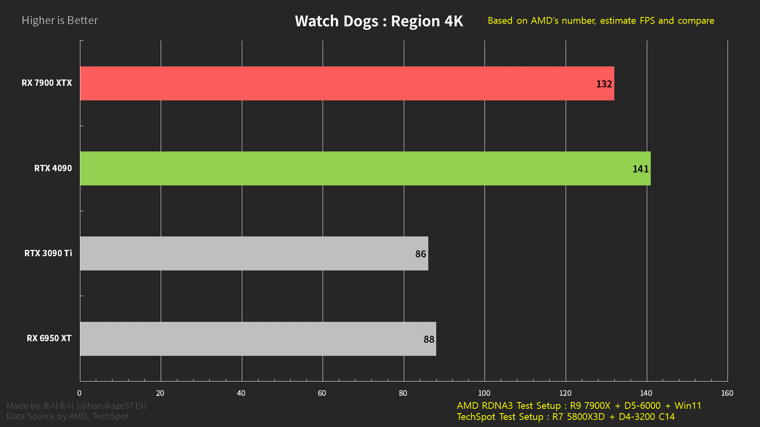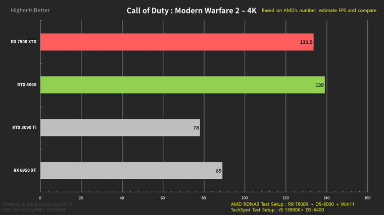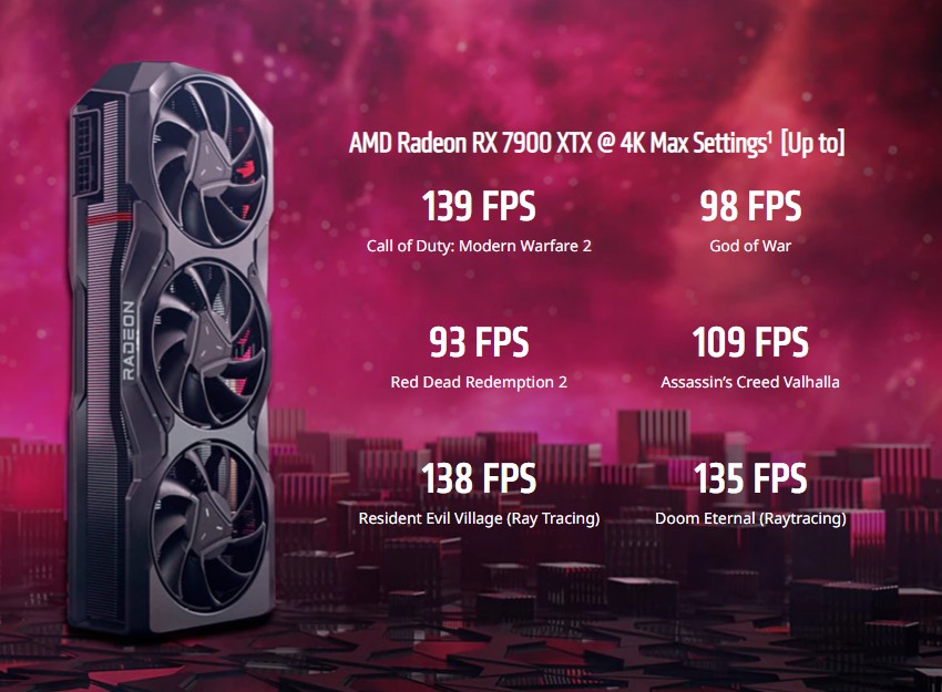 К сожалению, конкретными значениями кадровой частоты представители AMD в рамках анонса не поделились, однако, похоже, решили исправить свою оплошность, опубликовав показатели fps в ряде популярных игровых приложений для Radeon RX 7900 XTX на официальном сайте: исходя из представленных данных, флагман новой линейки в паре с настольным процессором Ryzen 9 7900X и оперативной памятью DDR5-6000 с активной функцией AMD Smart Access Memory в разрешении 4K при максимальных настройках качества графики в тайтлах Red Dead Redemption 2, God of War, Assassin's Creed Valhalla и Call of Duty: Modern Warfare II смог продемонстрировать результат в 93, 98, 109 и 139 fps соответственно, а в DOOM Eternal и Resident Evil Village с активной технологией трассировки лучей обеспечил 135 и 138 fps.