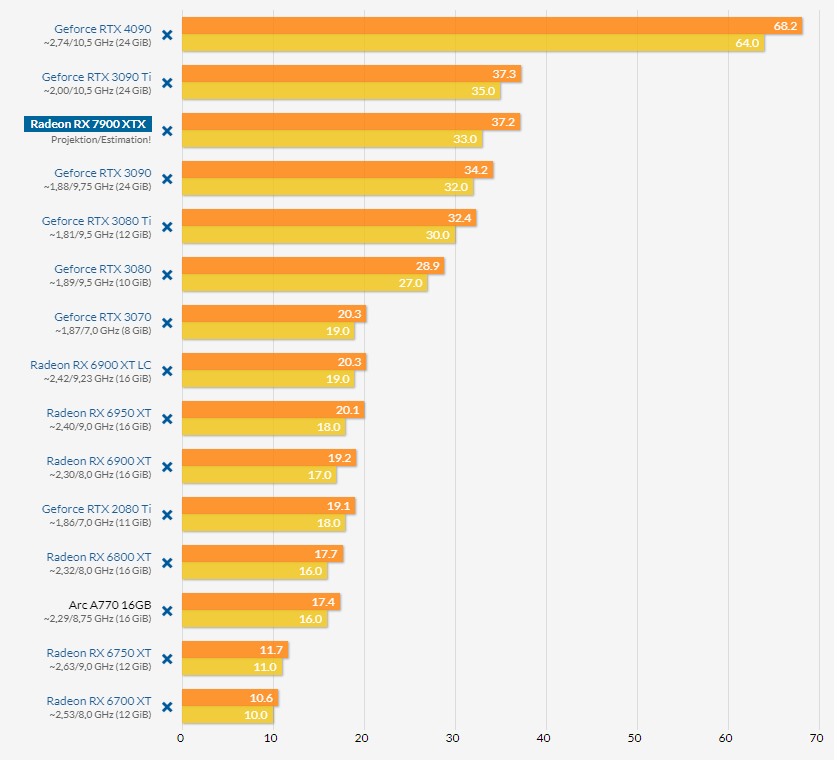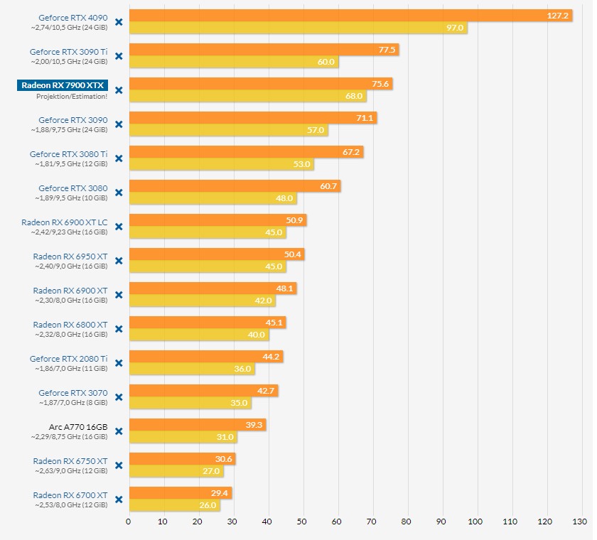 Буквально вчера AMD явила миру своё новое поколение игровых графических адаптеров, основанных на архитектуре RDNA 3, поведав о возможностях топовых представительниц новой серии в лице Radeon RX 7900 XTX и Radeon RX 7900 XT в сравнении с уровнем производительности их предшественниц, однако рассказать о результатах противостояния между своими новинками и их конкурентками из стана NVIDIA так и не отважилась: исправить данную оплошность вызвались специалисты ресурса PC Games Hardware, которые на основании «замеров» представителей «красной команды» рассчитали примерное быстродействие RX 7900 XTX в ряде игр.