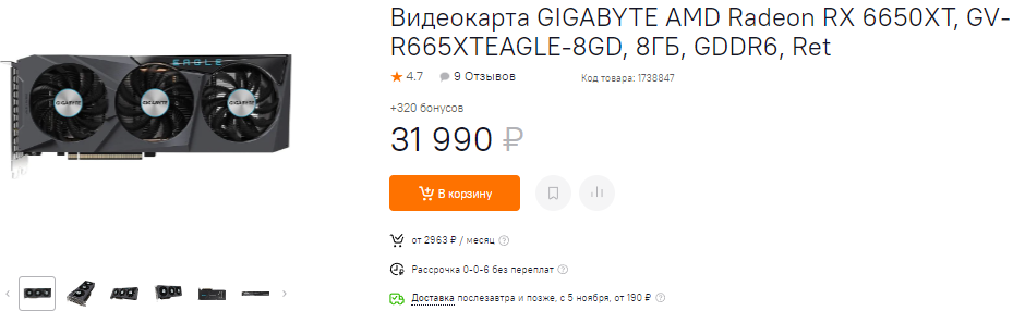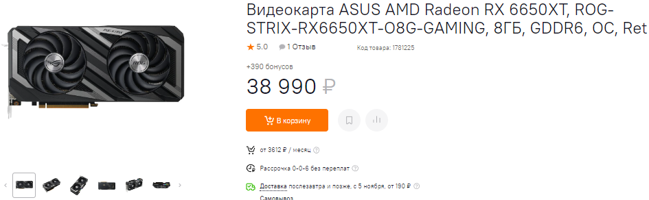 За 39 тысяч рублей вы можете купить видеокарту Radeon RX 6650 XT производства ASUS. Мы не будем спорить, ведь перед нами перспективная модель, способная показывать себя с лучшей стороны. Вот только за ту же цену есть недорогая Radeon RX 6700 XT. Было бы смешно отдавать предпочтения в пользу бренда, игнорируя здравый смысл. Если уж на то пошло, то возьмите Radeon RX 6650 XT от GIGABYTE. Здесь и цена н 6 тысяч рублей ниже, и система охлаждения лучше. И не говорите, что два вентилятора на ASUS круче трёх вертушек GIGABYTE. Словом, если как следует подумать, то можно сэкономить там, где большинство геймеров переплатят.