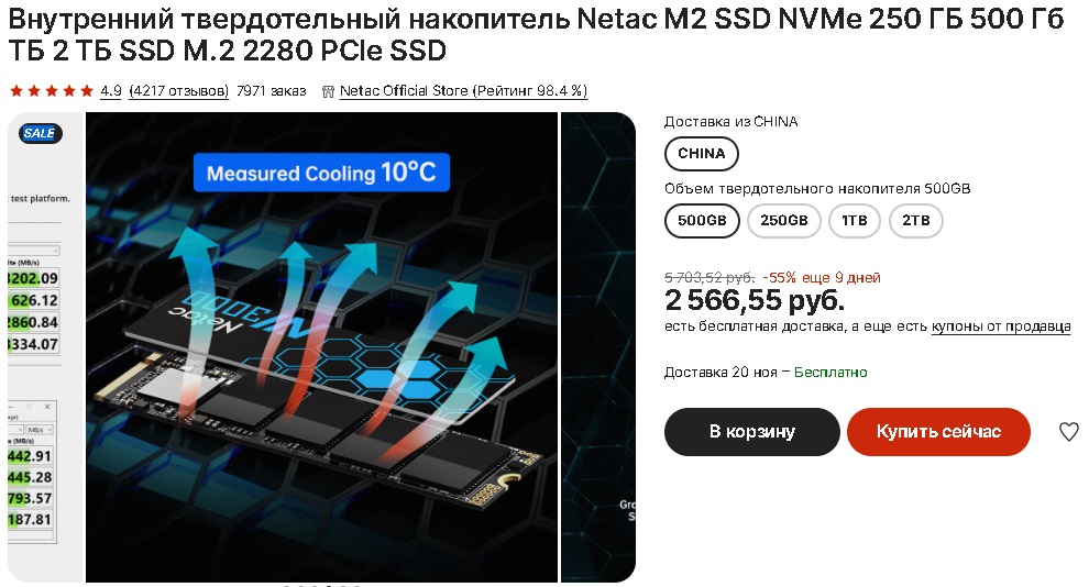 Хороший SSD m2 накопитель от бренда Netac c объёмом памяти на 500 гигабайт памяти