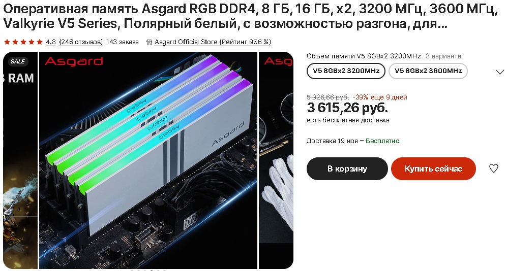 Модели Valkyria V5, как можно понять из названия, в радиаторы встроена RGB подсветка. Яркий, приятный глазу комплект оперативной памяти, при этом с неплохой частотой, для работы с тем же Ryzen 5 5600, частоты 3,200 хватит в самый раз. 16 гигабайт на сегодняшний день, это самый минимум для комфортной работы за компьютером, в играх или в других задачах. Для профессиональной работы с графикой так и вовсе лучше брать уже на 32 гигабайта. С дополнительной скидкой обходится данный комплект 3,422 рубля.
