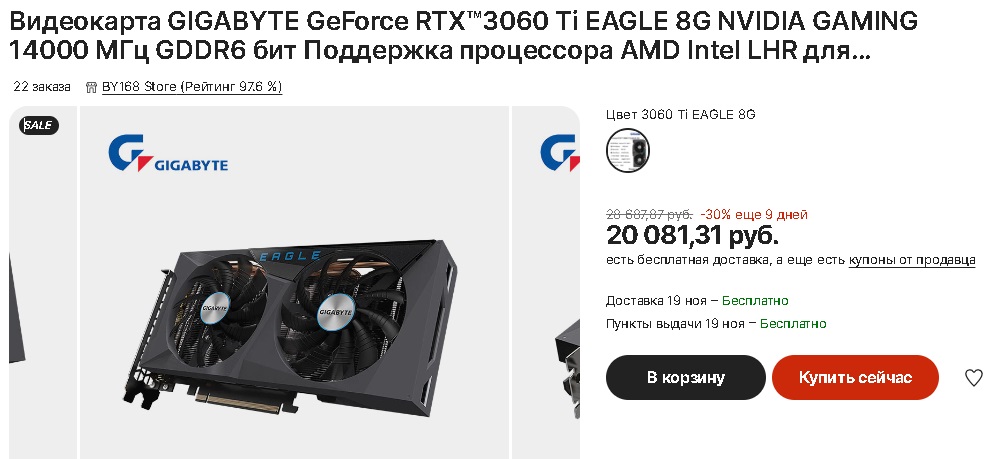 Безусловно одно из самых бюджетных исполнений данной модели, Gigabyte Eagle, но в целом RTX 3060 Ti это золотая середина между ценой и производительностью. В игровых тестах отстаёт на 5-10% от старшей Nvidia RTX 3070, хватает её с головой для высокого количества кадров даже в самых последних и требовательных играх. В QuadHD разрешении ближайшие годы данное решение будет радовать однозначно. Со всеми скидками покупка обойдётся 18,700 рублей