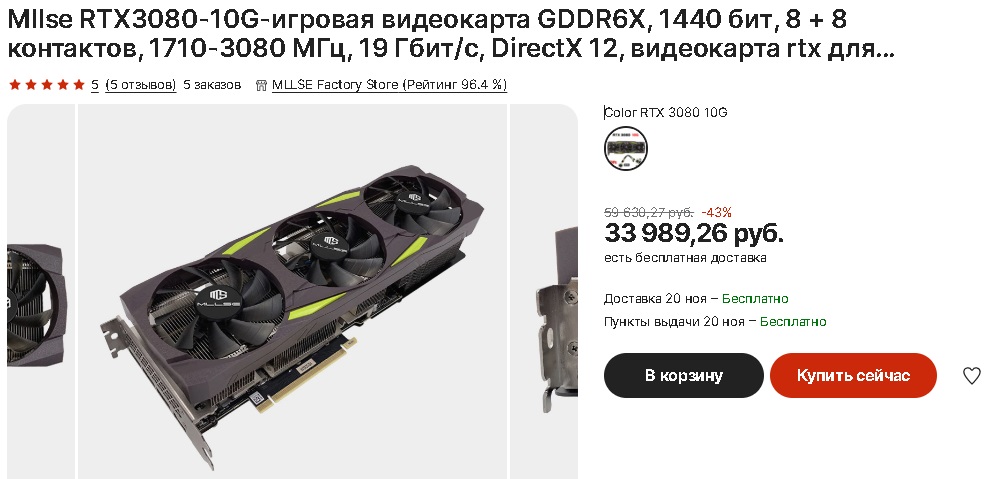 Далее вариант не для слабонервных: Nvidia GeForce RTX 3080 на 10 гигабайт видеопамяти от Mllse