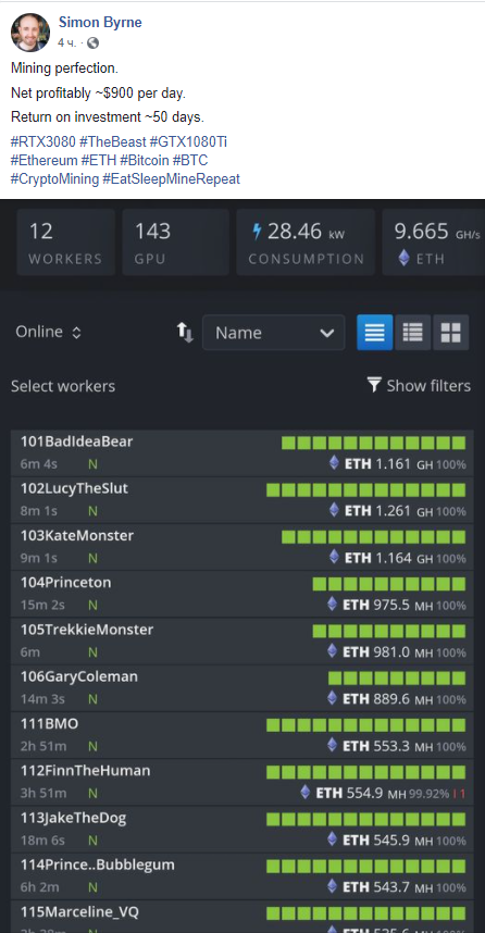 Он заявляет, что все 143 видеокарты приносят ему чистыми 900 долларов в день или 27 000 в месяц. Это значит видеокарты Саймону достались явно не за 1 000 долларов, ведь при таких условиях даже при текущих доходах ему бы потребовалось не менее трёх с половиной месяцев. Судя по всему, у Саймона действительно есть связи с крупным поставщиком, который продал ему целую партию по близкой к рекомендованной цене.