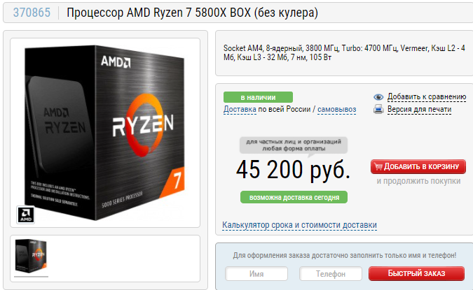 Ещё более мощно выглядит Ryzen 9 5950X. Это настоящий 16-ядерный монстр с тактовой частотой в 4.9 ГГц, способный в рабочих задачах обойти чуть ли не любой процессор Intel, вплоть до дорогих серверных чипов. Согласно данным ЯндексМаркета, за последнее время он неплохо подешевел, ведь его стоимость упала на 6 тысяч рублей. Ryzen 7 5800X также подешевел, но общее снижение цен на него составляет около 4 тысяч.