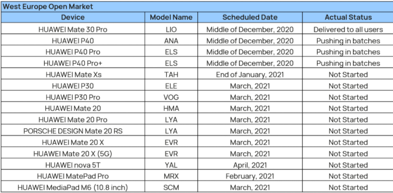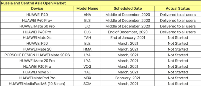 В данном случае мы приводим несколько официальных списков со сроками. Для большинства европейских стран подойдёт одна из региональных таблиц. Россия выделена в отдельный список. Там же можно изучить сроки и статус рассылки. Инсайдеры полагают, что уже к апрелю абсолютно все из представленных аппаратов смогут рассчитывать на выход прошивки, поскольку летом (по другим данным в начале осени) уже стартует обновление до Harmony OS.