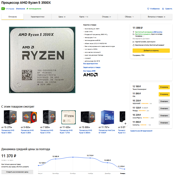 Но самое большое его преимущество кроется в цене. Согласно данным Яндекс Маркета его стоимость за последние 3 месяца упала с почти 13 710 до 11 370 рублей, что почти на 40% дешевле, чем средняя цена Ryzen 3600X. Одну из самых выгодных цен предлагает Регард, где данный процессор можно купить за 11 120 рублей. Если вы собираете систему только для игр, то переплачивать за 3600X особого смысла нет, а деньги лучше вложить в более мощную видеокарту.