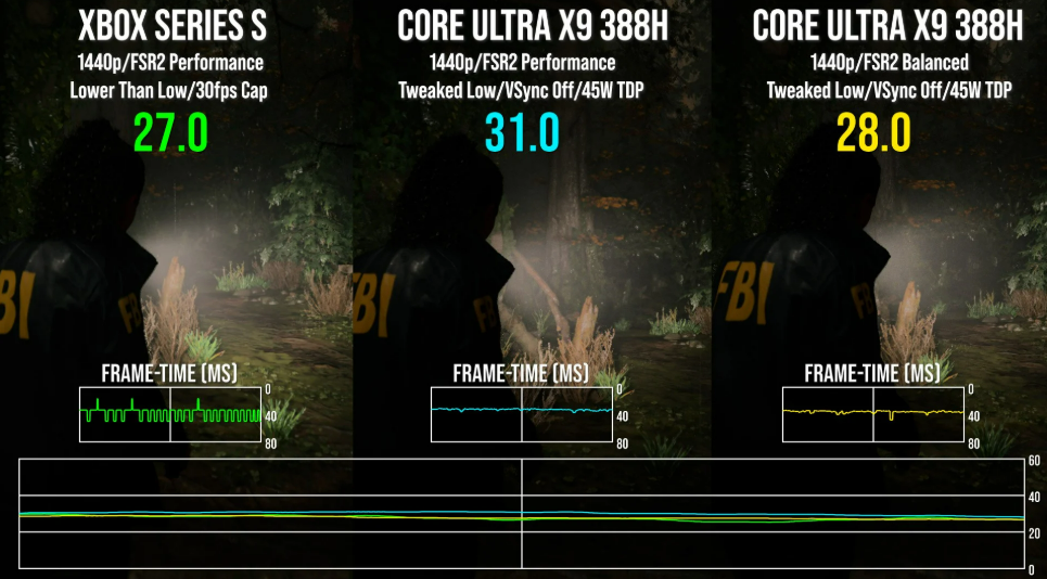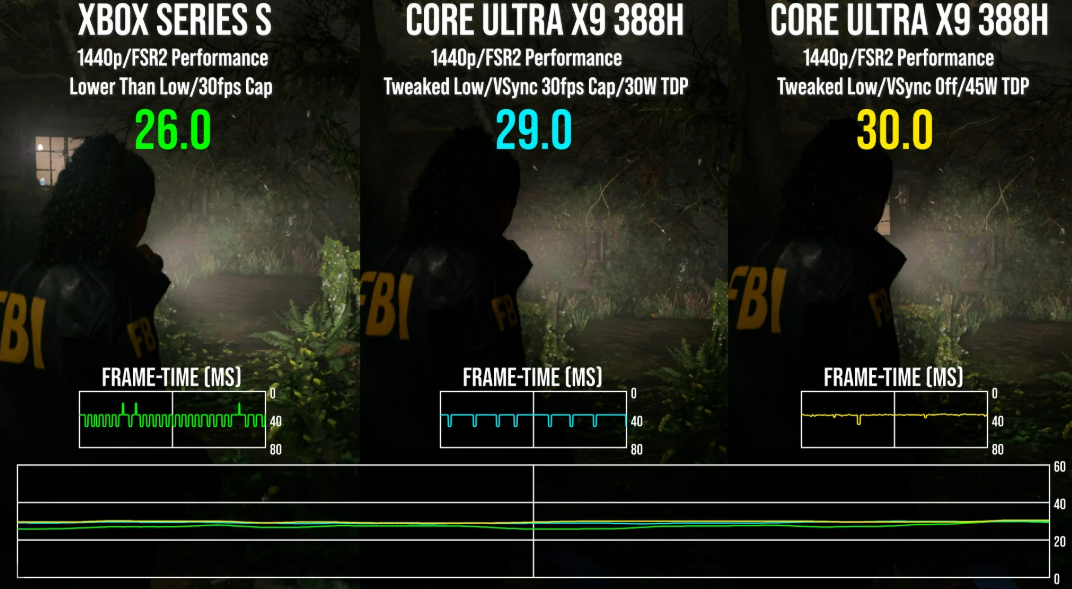 Ограничение в 30 Вт призвано отразить ограничения мощности, используемые в портативных ПК, где распространенным является значение от 25 до 35 Вт. Сравнение не является точным, поскольку настройки консоли и ПК не совпадают идеально. Xbox Series S работает в разрешении 1440p с масштабированием FSR 2 с разрешения 720p, а также с дополнительными вырезами таких элементов, как листва и тени, которые трудно воспроизвести на ПК.