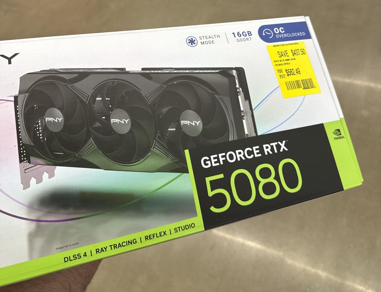 По словам пользователя Rinascimentale, в отделе распродаж электроники магазина Walmart он обнаружил видеокарту GeForce RTX 5080 производства PNY всего за 562 доллара США и поспешил её купить. Учитывая, что модель представляет собой версию с заводским разгоном (OC), её стоимость на старте продаж могла начинаться от 1100 долларов, то есть счастливчик заполучил видеокарту за вдвое меньший ценник по сравнению с MSRP. В настоящее время стоимость RTX 5080 начинается от 1400 долларов, что делает данную покупку ещё более выгодной.
