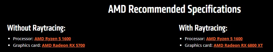 Как гласит страница на официальном сайте AMD, посвящённая Resident Evil Village, для организации качественного игрового процесса рекомендуется использовать как минимум 6-ядерный 12-поточный процессор AMD Ryzen 5 1600 и графический адаптер Radeon RX 5700, однако в данном случае ни о какой трассировке лучей, естественно, не может быть и речи, а вот для активации искомой технологии понадобится видеокарта Radeon RX 6800 XT.