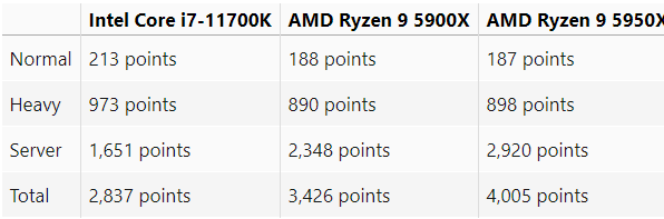 Интересно, что если добавить баллы, которые UserBenchmark присуждает в каждой категории (нормальный / тяжелый / сервер), то получается совсем другой результат благодаря дополнительным ядрам, которыми обладают процессоры компании AMD (12 для Ryzen 9 5900X, 16 для Ryzen 9 5950X):