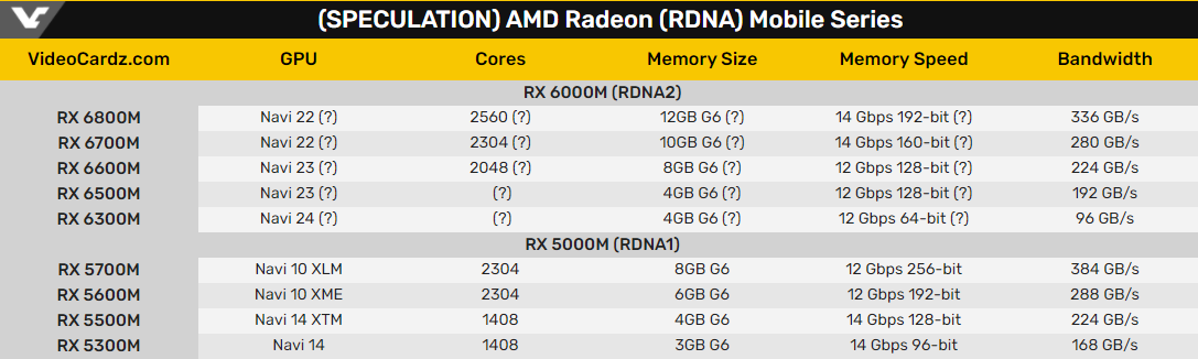 Согласно некоторым утечкам, видеокарты на базе Navi 22 Mobile получят 192-битный и 160-битный интерфейсы. Это означает, что высокопроизводительные модели получят 12 ГБ и 10 ГБ локальной памяти. Было бы разумно выпустить эти модели под названиями RX 6800M и RX 6700M. Navi 22 предложит до 40 вычислительных блоков, что составляет 2560 SP, а урезанный чип может иметь 2304 SP, прямо между полноценными чипами Navi 22 и 23.