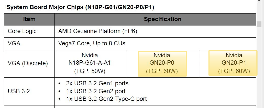На странице не приводится никаких дополнительных сведений, но согласно другим источникам, модели GN20-P1 и P0 должны быть ограничены мощностью 60 Вт. Это значение соответствует мобильной версии карты RTX 3060 с аналогичным энергопотреблением.