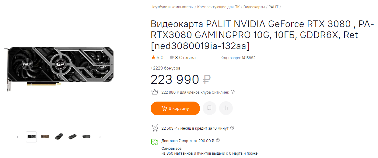 Первая на очереди GeForce RTX 3080. Сегодня найти сверхмощную геймерскую карточку по рекомендованной цене крайне сложно. В Ситилинк одна из моделей производства Palit оценена в 223 990 рублей (чуть более 3000 долларов). Согласно данным калькулятора на сайте F2pool, 8 таких карточек выдают 59.79 доллара. Таким образом одна обеспечивает уверенные 7.43 доллара в сутки, а вся ферма в месяц будет приносить 1793 доллара и 223 на одну единицу. Путём несложных подсчётов выясняем, что полная окупаемость фермы из 8 видеокарт (либо только одной карты) займёт больше 13 месяцев, а значить вернуть деньги практически нереально.