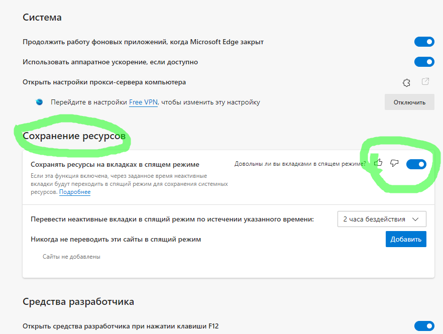 3). Включить/выключить «Экономить ресурсы с помощью спящих вкладок»;