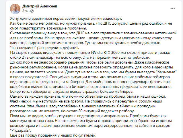 Если вы вдруг забыли весёлую историю с видеокартами GeForce RTX 3060, случившуюся в сети DNS, то давайте кратко её перескажем. Итак, за неделю до официальных продаж ребята заявили, что к ним идёт большая партия из 2000 штук. Ясно, что на всех не хватит, а значит недовольные всё равно бы остались, но также это значит, что 2000 геймеров могли стать куда счастливее. Увы, DNS сделал счастливее несколько десятков майнеров, которые воспользовались знакомствами с работниками магазинов и менеджерами.