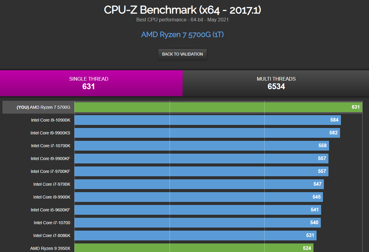 В тесте CPU-Z система на базе процессора Ryzen 7 5700G набрала 631 балл в однопоточном режиме, а также 6534 балла в многопоточном режиме. Процессор продемонстрировал отличный результат в однопоточном режиме, который превышает производительность процессоров Intel Core i9-10900K, Core i9-9900KS и Core i7-10700KF.