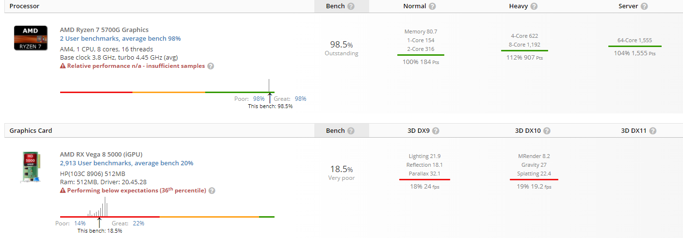 Что касается UserBenchmark, то результаты Ryzen 7 5700G получились выше среднего и составили 98 баллов для процессорной части и 19 баллов для графического процессора.