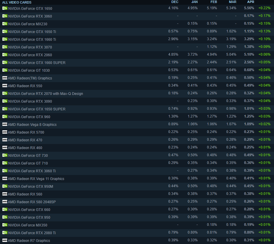 Для того чтобы оценить, много ли видеокарт получили геймеры в апреле, взгляните на график выше. Это данные за февраль, когда первые две модели увеличили процентное соотношение больше, чем 50 видеокарт вместе взятые в прошедшем месяце. Изучать долговременные изменения по данным Steam сложно, а вот делать выводы на основе текущих данных можно. Очевидно, что апрель стал одним из самых плохих месяцев для покупки видеокарты.