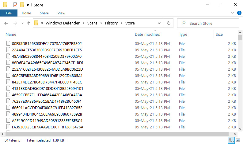 Ошибка появилась в Защитнике Windows 1.1.18100.5 и ведет к тому, что папка C:\ProgramData\ Microsoft\Windows Defender\Scans\History\ Store заполняется тысячами файлов с именами, которые выглядят как хэши MD5. Размер создаваемых файлов варьируется от 600 байт до чуть более 1 КБ.