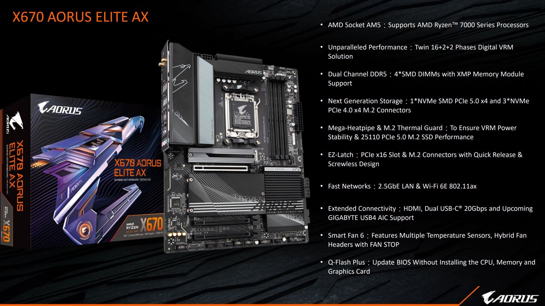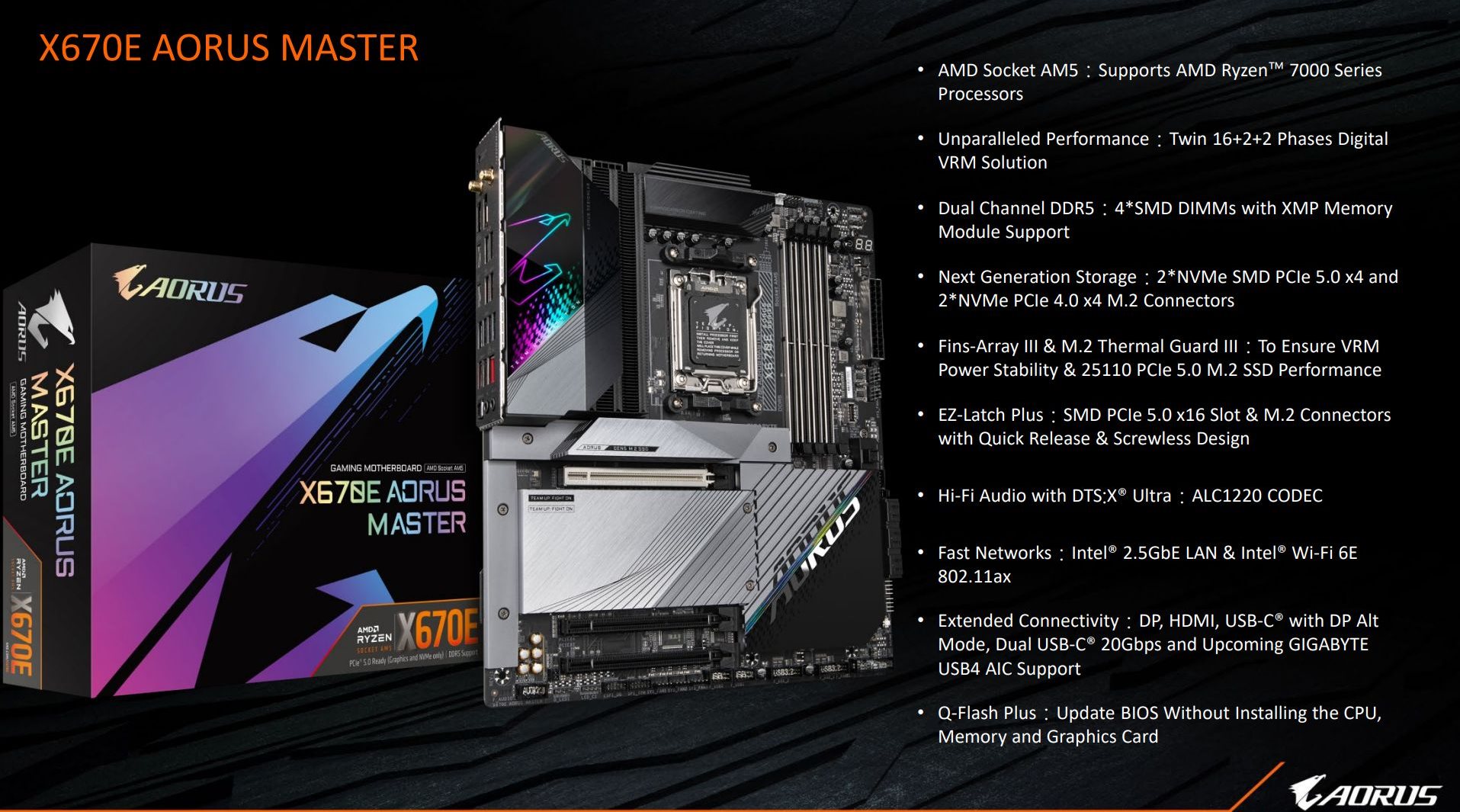 Наконец, GIGABYTE показала сразу четыре новых модели, среди которых топовая X670E AORUS XTREME, отличающаяся наличием (18+2+2)-фазного VRM-модуля и 10-гигабитного Ethernet-порта, а также её более «простые» соплеменницы в лице X670E AORUS MASTER, X670 AORUS PRO AX и X670 AORUS ELITE AX с подсистемой питания, организованной по схеме 16+2+2.
