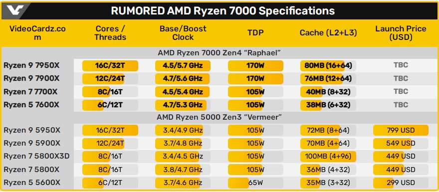 Что касается уровня энергопотребления будущих новинок, то значения TDP для Ryzen 9 7950X и Ryzen 9 7900X должны составить 170 Вт, а для Ryzen 7 7700X и Ryzen 5 7600X — 105 Вт.