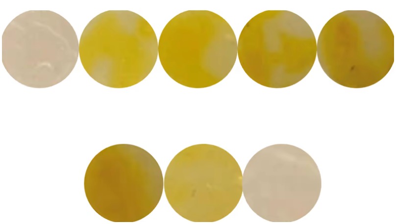 Пленочные диски, использовавшиеся в исследовании. Чем ярче желтый цвет, тем больше нитритов содержится в исследуемом мясе.