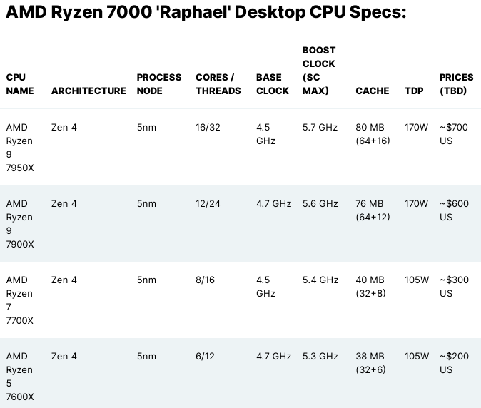 Как утверждает источник, первыми «на сцену» выйдут как минимум четыре представителя нового поколения — AMD Ryzen 5 7600X, Ryzen 7 7700X, Ryzen 9 7900X и Ryzen 9 7950X. Новинки, получившие кодовое имя Raphael, будут выпускаться по 5-нм технологическому процессу и станут первыми представителями новой архитектуры Zen 4 в десктопном сегменте.
