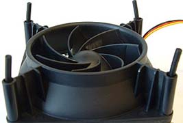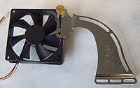 Для охлаждения пышного букета лепестков, в комплекте с радиатором поставляется также 92мм вентилятор. Его крепление осуществляется с помощью изогнутого металлического кронштейна, привинчивающегося к трем верхним отверстиям, используемым в корпусе для фиксации плат расширения. Попытка запустить такой вентилятор на полных оборотах столкнется, скорее всего, с негативными эмоциями домочадцев, недовольных высоким уровнем шума. Именно для этого случая Zalman предлагает использовать находящийся в комплекте с кулером переходник, позволяющей переключать напряжение питания ветродува между 12В и 5В.
