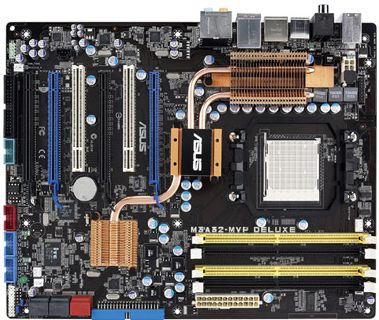 Вторая материнская плата называется Asus M3A32-MVP Deluxe, она тоже основана на чипсете AMD 790FX, но лишена второго гигабитного сетевого порта, контроллера беспроводной сети WiFi 802.11b/g и радиаторов Cool Mempipe для модулей памяти.