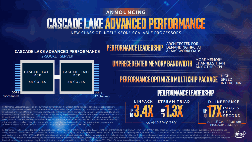 Процессоры нового поколения базируются на архитектуре MCP (Multi-Chip Package), а поэтому имеют несколько кристаллов, подобно AMD Ryzen Threadripper, что позволяет добиться впечатляющих 48 ядер на процессор, а при использовании в двухсокетных системах количество ядер вырастает до 96, что даёт 192 потока при использовании hyper-threading, если, конечно, Intel расщедрится на её внедрение. Помимо этого, процессоры Cascade Lake-AP смогут похвастаться поддержкой 12 каналов DDR4, а вот о максимальном объёме поддерживаемой памяти пока ничего не известно. Подобные характеристики, по словам специалистов Intel, позволили одержать верх над соперником в лице AMD EPYC 7601 в Linpack (производительнее в 3,4 раза) и Stream Triad (в 1,3 раза).