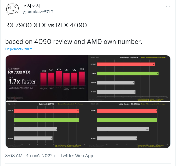 [Radeon RX 7900 XTX] предназначен для конкуренции с 4080, и у нас нет показателей производительности 4080. Это основная причина, по которой вы не видели никаких сравнений с NVIDIA. […] Карта за 999 долларов не конкурент 4090, которая стоит на 60% дороже, это конкурент 4080.