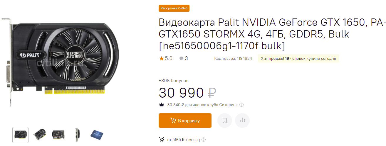 На первом месте неумирающая классика: GeForce GTX 1050 Ti. Только вдумайтесь, 49 геймеров купили видеокарту производства Palit за 25 тысяч рублей. Надеяться на высокую производительность с такой видеокартой не приходится, но это не только самое популярное предложение на российском рынке, но и самое эффективное по соотношению цены и производительности.