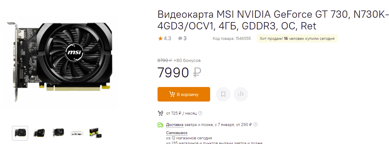 На последнем месте в топе GeForce GT 730. Подобные карты берут в качестве затычек, ведь они не предназначаются для геймеров. Играть на GeForce GT 730 можно исключительно в старые стратегии или нетребовательные инди-проекты. Модель производства MSI стоит 8000 рублей, что явно не соответствует её положению.