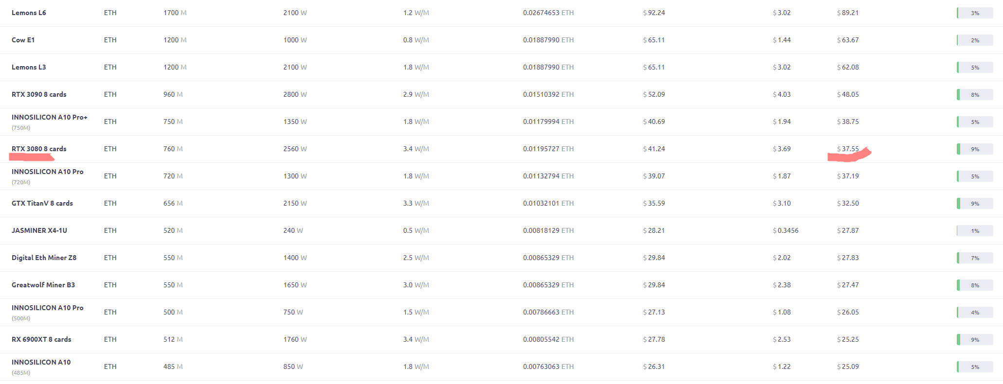 Но нас с вами интересует Эфир, ведь чем хуже майнерам тем быстрее мы получим недорогие видеокарты. В качестве примера мы соберём виртуальную ферму на 8 видеокарт GeForce RTX 3080. Как видите, ферма приносит в сутки 37.55 доллара, а значит в месяц можно добыть 1126 долларов, что равняется 86 000 рублей. Среднестатистическая GeForce RTX 3080 стоит 173 000 рублей. Получается, что отбить вложения в ферму на 8 таких видеокарт общей стоимостью 1 384 000 рулей удастся за 16 месяцев. На самом деле больше, ведь в таблице указана стандартная видеокарта без наличия блокировки хешрейта. Поскольку майнерам удалось вернуть часть хешрейта, то сегодня доходность на GeForce RTX 3080 доходит до 70%, а значит прибавляем ещё 30% к нашим 16 месяцам.
