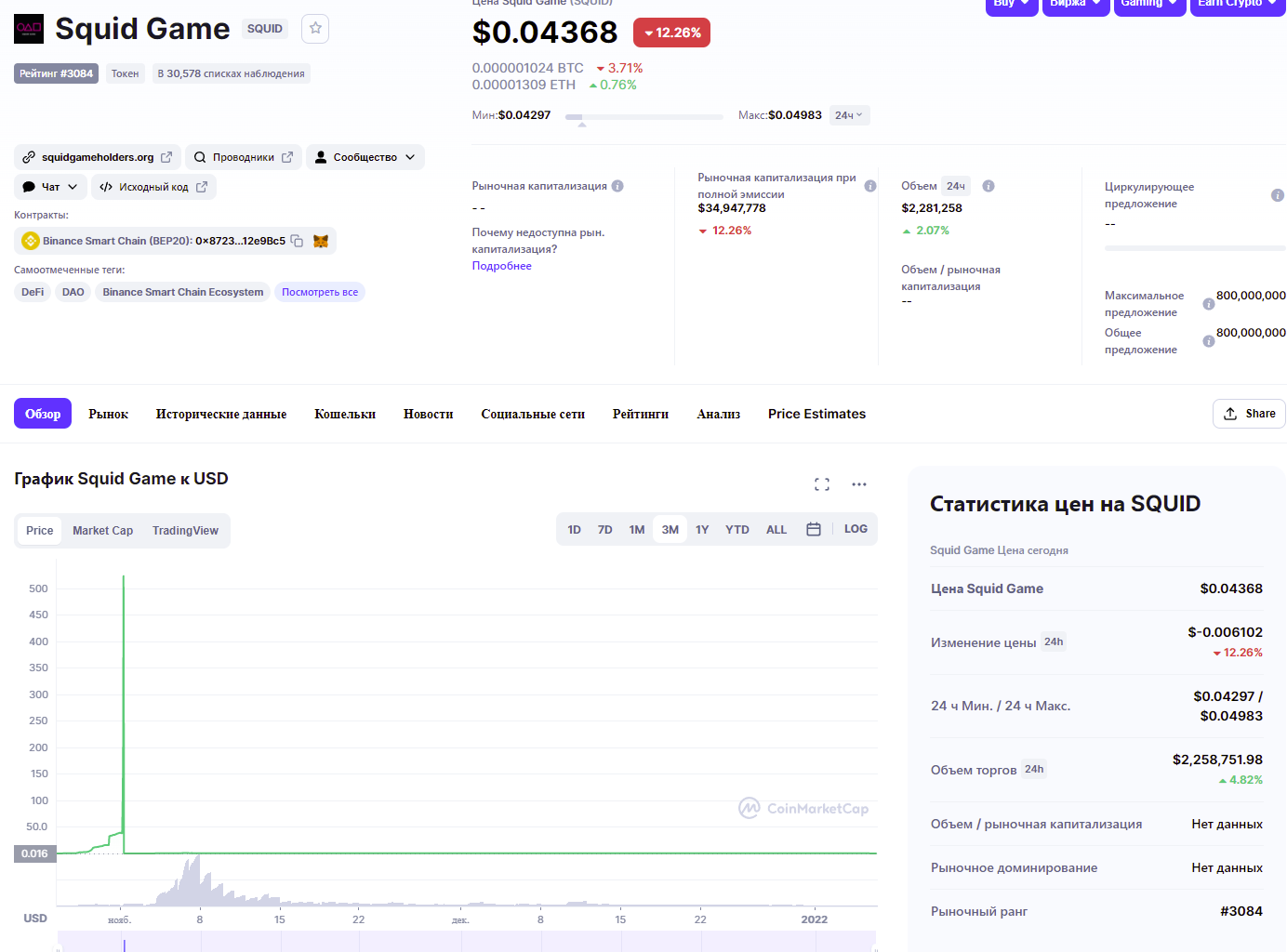 Внезапное возвращение Squid Game. Это была самая желанная криптовалюта осени 2021 года. На фоне сериала «Игра в кальмара» группа мошенников выпустила одноимённый токен, а после скрылась в неизвестном направлении с миллионами долларов. Не так давно вернуть криптовалюту к жизни решили члены сообщества. Они реанимировали сайт, разместили токен на нескольких биржах, где он сегодня свободно торгуется. О былом величии не может быть и речи, но находятся и те, кто продолжает покупать Squid Game. Есть мнение, что после выхода второго сезона одноимённого сериала токен может снова подорожать. Здесь всё на уровне фанатской веры, хотя идея не лишена логики.