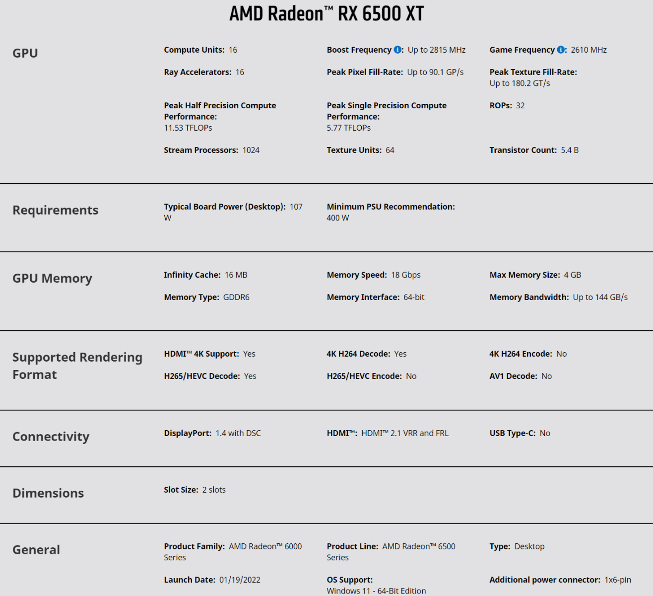 Представители AMD заявляют, что поставили себе амбициозную цель: выпустить графический чип стоимостью 199 долларов, который будет оставаться игровым, обеспечивая высокую производительность в играх. Очевидно, что дорогостоящая память не позволила бы уложиться в 8 Гб GDDR6. Кроме того утверждается, что узкая шина не так важна, ведь Radeon RX 6500 XT поддерживает технологии FSR и RSR. Это значит, что отличной производительности можно будет достичь за счёт масштабируемости, а сама карта будет способна обеспечить высокие настройки графики в разрешении 1080р и средние в 2К.