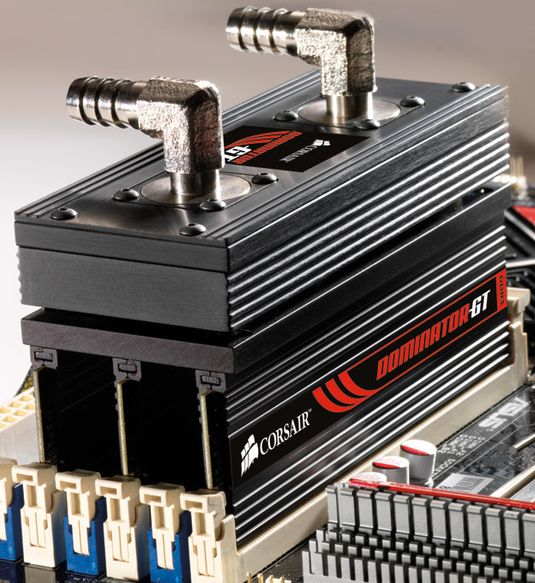 Игольчатые радиаторы на верхней грани модулей памяти серии Dominator-GT крепятся винтами, их можно снимать. Заменить эти радиаторы можно на водоблок или даже гибридную систему охлаждения с использованием модуля Пельтье, который снижает температуру памяти на 20 градусов Цельсия по сравнению с температурой окружающей среды.