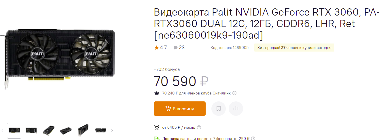 Ну а геймеры празднуют, ведь цены на видеокарты на российском рынке действительно пошли вниз. Сегодня мы кратко изучим предложения 5 февраля в магазине Ситилинк и убедимся в том, что купить подходящую модель может чуть ли не любой геймер. Прежде всего отметим огромный интерес к GeForce RTX 3060. Как видите, за 5 февраля две модели производства Palit куплены в количестве 57 единиц. Причина может быть в том, что многие пользователи так и не дождались скидок на GeForce RTX 3050, докинув несколько десятков тысяч рублей до более внушительной видеокарты. В логике этим ребятам не откажешь, ведь с GeForce RTX 3060 можно несколько лет не думать о проблемах дефицита и дороговизны.