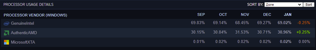 Всё это фундаментальные факторы, тормозящие развитие полупроводниковой отрасли, но нас с вами интересует реальное положение на рынке, поэтому заглянем в Steam, где доступна статистика как по отдельным моделям, так и в целом по занимаемой доле. Прежде всего плохие новости для Intel. Линейка Alder Lake пусть и оказалась удачной, но лишь отчасти замедлила наступление AMD. Рост красных составил 0.25% за январь, но могло быть и больше, если бы Лиза Су решилась на снижение цен на настольные процессоры. Положение Intel стабильно, а наличие собственных производственных мощностей позволяет не думать о полупроводниковом кризисе.