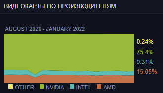 Если внимательно изучить таблицу наиболее популярных видеокарт, то описанная выше тенденция становится очевидна. Балом правят ноутбуки с мобильными графическими чипами. 4 и 5 позицию занимает AMD, хотя обычно красных в топ 20 вообще не бывает. В десятке два GPU Intel, включая Iris Xe Graphics и UHD Graphics. Огромным спросом пользуются бюджетные GeForce GTX 1050 Ti и GeForce GTX 1030. Выход новых видеокарт AMD и NVIDIA пришёлся на конец января, поэтому не отразился на статистике. Вполне возможно, что мы не увидим GeForce RTX 3050 с Radeon RX 6500 ХТ и в февральском топе. Поставки бюджетных видеокарт оказались разочаровывающими, а цены значительно выше, чем ожидали даже самые большие пессимисты.