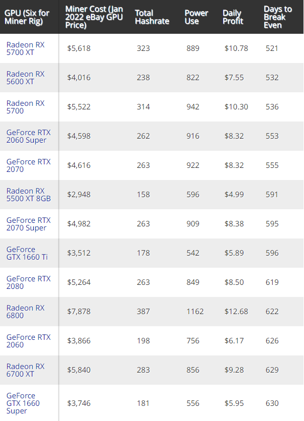 Самой "выгодной" в майнинге эфира можно назвать Radeon RX 5700 XT, но это не отменяет того, что ферма начнёт давать первые плоды аж спустя 521 день. Общая стоимость комплекта из 6 карт вместе с другими компонентами (смотрите ниже) затянет $5 620. В день ферма будет приносить почти $11.