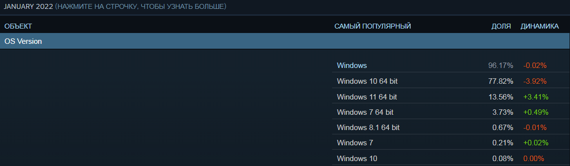 Многие пользователи, в том числе и среди геймеров, считают операционную систему Windows 11 "проходной", такой же, как Vista или Windows 8.1, и не спешат ее устанавливать, что подтверждается относительно скромными темпами прироста числа компьютеров и ноутбуков с данной ОС. Если взглянуть на обновленную статистику популярного игрового сервиса Steam от компании Valve за январь 2022 года, несложно заметить, что Windows 11 установлена менее, чем на 14% ПК и лэптопов.