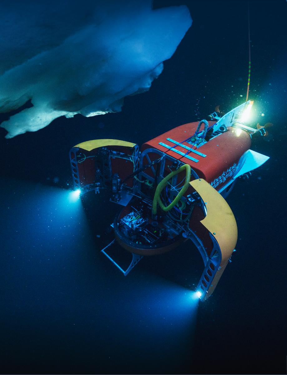 Nereid Under Ice (NUI) с открытыми створками приборного отсека готов к сбору образцов во время экспедиции 2019 года в Северном Ледовитом океане. Миссия под руководством UT Austin будет зависеть от способности аппарата работать в сложных условиях подводной среды больших ледников Гренландии. Credit: Luis Lamar, courtesy of the Avatar Alliance Foundation.