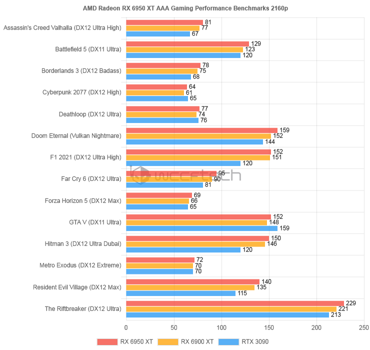 За эту неделю в сети появилось много информации о новых видеокартах AMD Radeon RX 6x50 XT, характеристики, ожидаемые цены, производительность в бенчмарках, а теперь и в играх — большую подборку результатов опубликовал ресурс Wccftech, ссылаясь на данные AMD. В разрешении 4K новый флагман линейки Radeon RX 6950 XT в среднем оказывается на 11% быстрее NVIDIA GeForce RTX 3090, что интересно, относительно базовой версии Radeon RX 6900 XT прирост 4%. Т.е. обе видеокарты сейчас конкурируют с бывшим флагманом линейки NVIDIA Ampere. Есть результаты для ряда избранных игр с трассировкой лучей, новый флагман AMD конкурентоспособен в F1 2021 и Resident Evil Village, быстрее в Far Cry 6, но на 10% медленнее в Deathloop. Новинка AMD ожидается по рекомендованной цене 1099 долларов США.