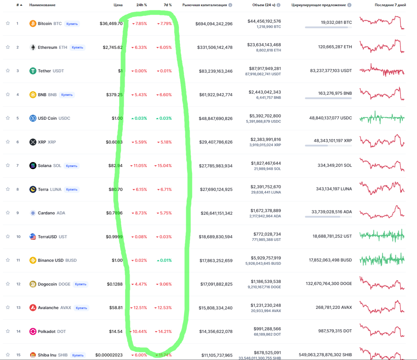 Но вернёмся к фактам. Итак, вчера ФРС опубликовала данные по повышению ключевой ставки на 50 пунктов до 1%. Это стало ответом на резкий рост инфляции, которая по итогам 2021 года достигла 8.5%, что оказалось самым большим показателем за 40 лет. Первый удар пришёлся по фондовому рынку, когда Nasdaq обвалился на 4.99%, утянув за собой целый ряд смежных секторов. Больше всех пострадали криптовалюты. На момент написания данного материала Биткоин торгуется на отметке в 36 440 долларов, но кратковременное падение достигало 35 тысяч долларов, что вызвало настоящую панику. Эксперты полагают, что цифровое золото висело на волоске. Стоит только уйти ниже критической отметки в 35 тысяч долларов, и рынок криптовалют будет не остановить.