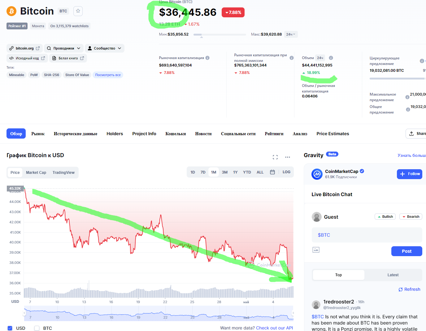 Схватка медведей и быков разыгралась не на шутку, а где-то в тени можно заметить с трудом различимые действия Китов. Крупная рыба уже много лет раскачивает криптовалюты, зарабатывая на разнице в цене, покупая на низах и продавая на пиковых значениях. Как вы понимаете, сложность состоит в поиске таких значений, но в руках у Китов есть огромная финансовая подушка. Позволяющая совершить разворот на самых опасных позициях. Ещё вчера Биткоин дорожал. Казалось, что это тот самый случай, когда цифровое золото достигнет 42-43 тысяч долларов за монетку, и только после этого снова упадёт, но на этот раз что-то пошло не по плану.