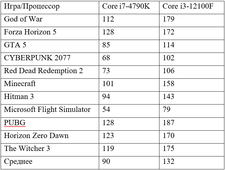 Что же, с тех пор прошло слишком много времени, поэтому мы даже не можем себе представить, действительно ли этот процессор до сих пор актуален, или некоторые наши читатели слегка лукавят. Поскольку разобраться в вопросе крайне сложно, то мы решили изучить тесты, проведённые командой Testing Games. Блогеры взяли старый флагман 2014 года и сравнили его с самым бюджетным представителем линейки Alder Lake – Core i3-12100F. В качестве видеокарты использовалась GeForce RTX 3080. Напомним, Core i7-4790K имел 4 ядра и мог разгоняться до 4.4 ГГц. В то же время выпущенный спустя 8 лет Core i3-12100F лишён многопоточности и разгоняется до 4.3 ГГц, но имеет гораздо более эффективную архитектуру и 10-нм техпроцесс. Давайте взглянем в таблицу и сделаем выводы.